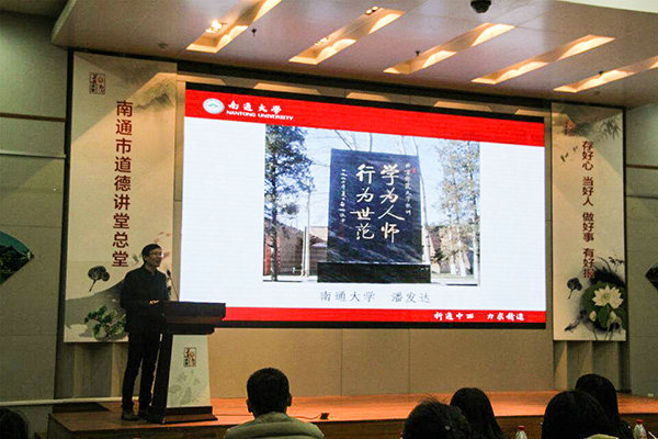 12月2日下午,由南通市文明委主办,我校党委宣传部、教育科学星空网页版登录入口承办的“以德立人,为人师表”道德讲堂活动在南通市道德讲堂总堂——南通博物苑报告厅举办。南通市文明办副调研员颜静处长、南通大学宣传部汤荣光副部长莅临活动现场,星空网页版登录入口党总支副书记徐红波、生科院党总支副书记胡春花以及建工星空网页版登录入口、理星空网页版登录入口的负责同志、辅导员老师和学生骨干到现场观摩。