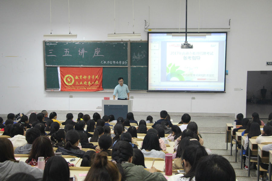 10月26日下午两点,南通大学教育科学星空网页版登录入口特邀中公名师王堂堂老师在9号教学楼201教室举办以“教师招聘备考指导”为主题的三五讲座,共有200多名同学参加此次讲座。