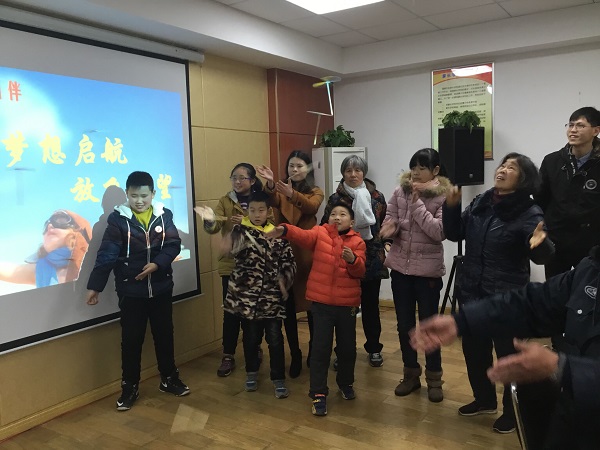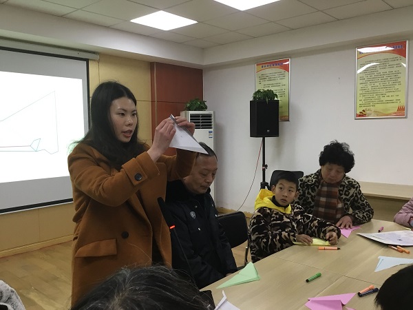 9:00还不到,辖区内的老年人和孩子们怀着好奇心将课堂坐得满满的,很多送孩子前来的家长也留下来观摩。课堂一开始,志愿者就打破了孩子们传统意义上纸飞机的折叠方法,将三角形的彩纸对折,再将对折后的两边分别折出两个翅膀,很快,一个个五颜六色的纸飞机就诞生了。接着,便是见证“奇迹”的时刻,志愿者用课本大小的纸板垂直于纸飞机的下方,纸飞机竞奇迹般的在纸板的带动下自己飞起来。在志愿者手把手的指导下,在场的大人和小孩子们都跃跃欲试,将自己的纸飞机放飞起来。从这样一个看似不可思议的现象里,志愿者向孩子们讲解了这个现象背后空气动力学的科学奥秘。
