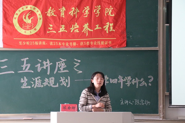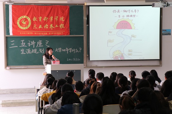 10月24日13:30,南通大学教育科学星空网页版登录入口在主校区8号教学楼309教室成功举办了以“生涯规划——大学四年学什么”为主题的三五讲座,本次讲座由陈念劬老师担任主讲嘉宾,来自教科院的160余名本科生参与了此次讲座。