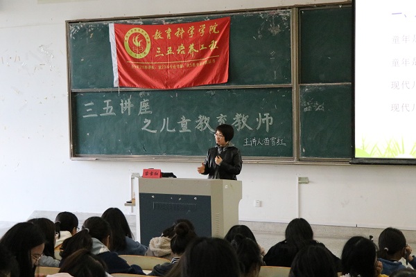 11月20日下午,南通大学教育科学星空网页版登录入口于9号楼202教室举办以“儿童教育教师”为主题的三五讲座。此次讲座由苗雪红老师主讲,教科院280余名同学到场聆听。