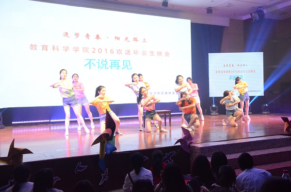 晚会在极具震撼力的荧光水鼓舞中拉开序幕。啦啦操、儿童舞、音诗画、大合唱等节目立足教科院专业,生动展现了教科院学子的青春活力。悠扬空灵的音乐,行云流水的舞姿,无不引人入胜,令人称绝。相声表演《我们》、情景剧《时光聚会》更是以幽默风趣的台风,令人耳目一新,赢得了观众们经久不息的掌声。“唇枪舌剑”社团的B-BOX、Rap表演带动了全场的气氛,获得观众热烈响应。音诗画表演《每当走过老师窗前》、《奋斗的青春最美丽》、《我们毕业了》带领大家共同追忆大学时光,深情倾诉对母校的眷恋不舍之情,展现了教科院莘莘学子昂扬向上的精神风貌。每个精彩演绎的节目,都是真情的诉说,毕业生们用自己的歌声与舞姿演绎着青春无悔的旋律,用笑脸与泪水表达着对母校的无限祝福和依恋,用各自的才艺展示为大学画上一个圆满的句号。