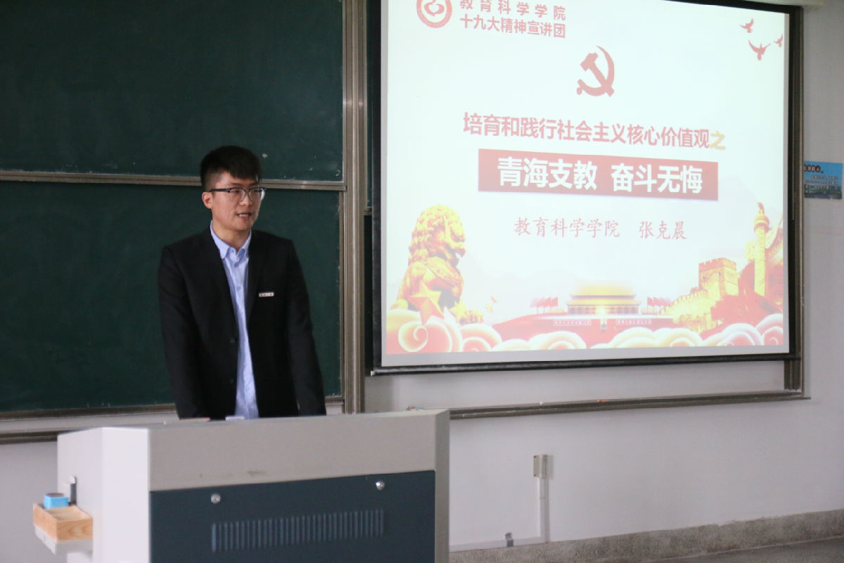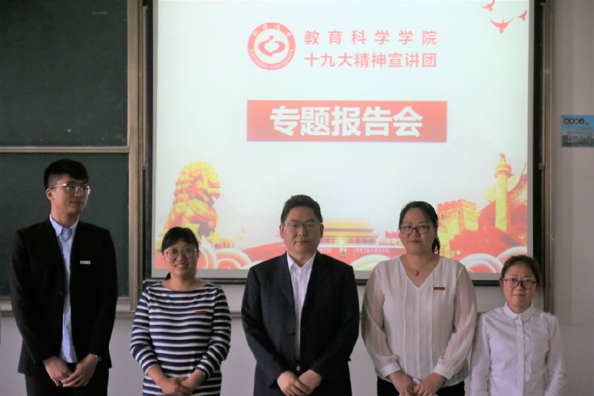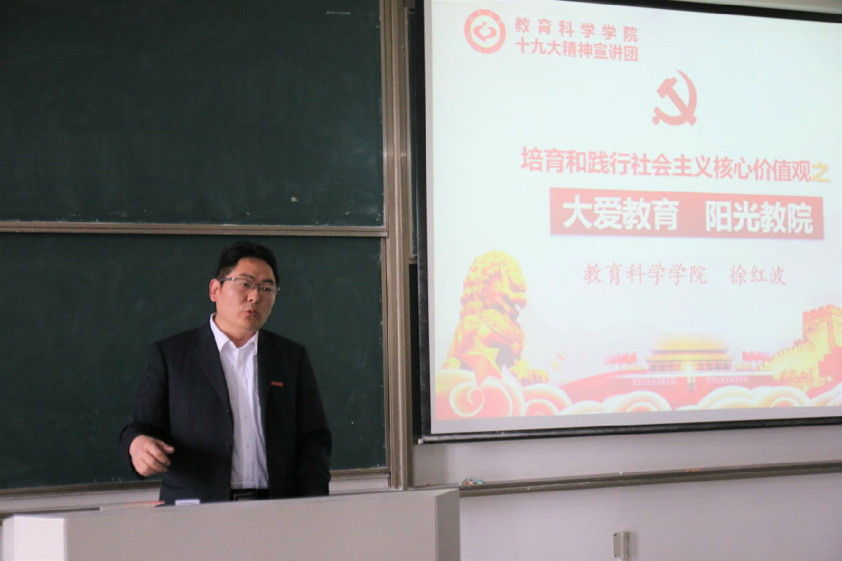 4月21日上午,由教育科学星空网页版登录入口党总支副书记、副院长徐红波,学工办主任陈淑慧,分团委书记魏琳及优秀学生代表张克晨、陈幸佳组成的十九大精神宣讲团为第二十二期入党积极分子培训班学员作“十九大精神”专题报告会。