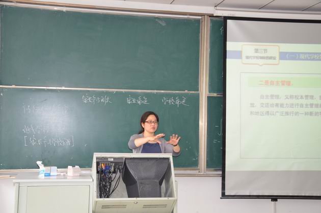 本次示范课由教师教育系 王珏 教授主讲,她向来自教师教育系、初等教育系、学前教育系、应用心理系及教育技术系的三十多位老师充分展示了其个人教学风采。示范课围绕“现代学校制度建设”的主题内容,从“现代学校管理的体制问题”、“现代学校制度的主要特征”、“现代学校制度的建设思路”三个层面展开,以清晰的脉络,运用辅助教学手段,采用“问题导向”的教学方法,为学生提供精心设计的“微视频”资料,引导学生对“现代学校制度建设问题”展开讨论,进而拓展学生视野延伸至课外研究。 王珏 教授的课堂教学设计内涵丰富,教学内容重点突出,各教学环节把握得当,形成条理清晰、循循善诱的教学思路,教学效果反响良好。