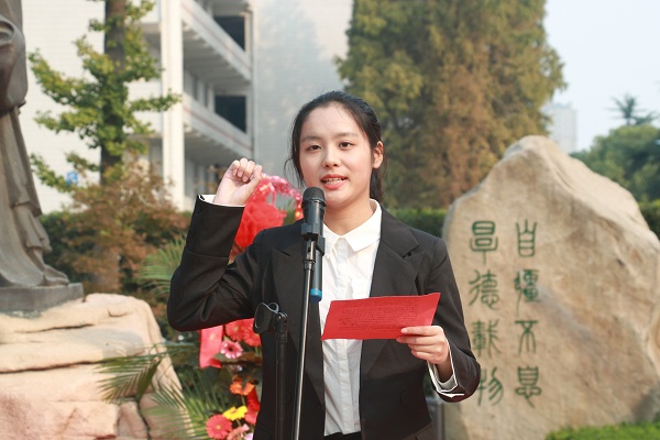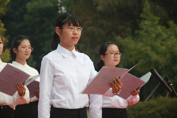 仪式上,师范生代表集体朗诵了《论语》片段,用这一方式重温先贤的人生智慧,体悟作为一名教师应有的道德情操。来自小学教育乡村定向师范182班的成一天同学代表全体师范生发言,她号召2018级全体师范生们践行孔子教育理念,传承中华优秀传统文化,履行时代所赋予的光荣使命,并带领全体师范生进行了庄严的宣誓:立志扎根农村教育事业,成为有理想信念、有道德情操、有扎实学识、有仁爱之心的好老师。