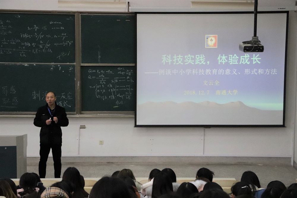 12月1日下午,我院实验中心邀请启东市大江中学文云全老师、启东市紫薇陈永飞老师来校指导儿童科技活动指导实训室建设,并为我院小教16级学生做科技教育专题讲座。