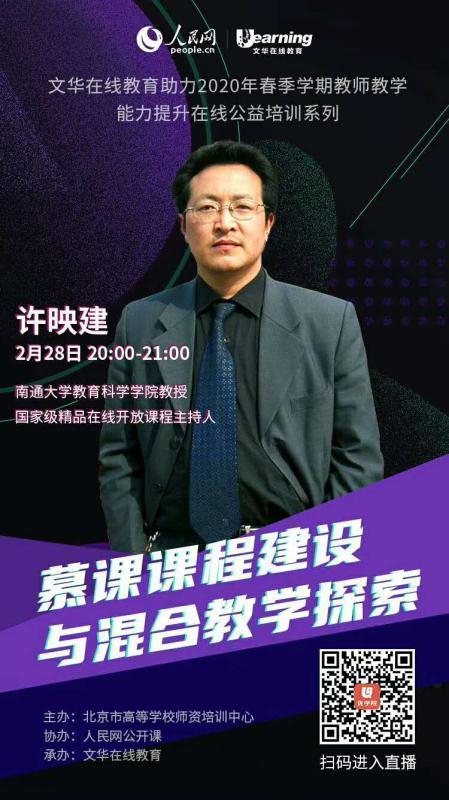 2月28日晚,国家级精品课程《教师职业道德与教育政策法规》主持人、南通大学教育科学星空网页版登录入口许映建教授对全国直播了一堂人民网公开课:慕课课程建设与混合教学探索。本次直播由北京高等学校师资培训中心主办,文华在线教育承办。