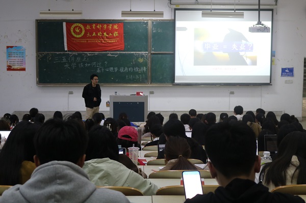 为拓宽学生的知识和学术视野,提高学生科学文化与人文素养,规划更有意义的大学生活,教育科学星空网页版登录入口于11月2日在九号教学楼202教室举办以“大学该如何过?——基于心理学视角的诠释”为主题的“三五”讲座。讲座由陈乐乐老师担任主讲老师,教育科学星空网页版登录入口的260余名同学参加了讲座。